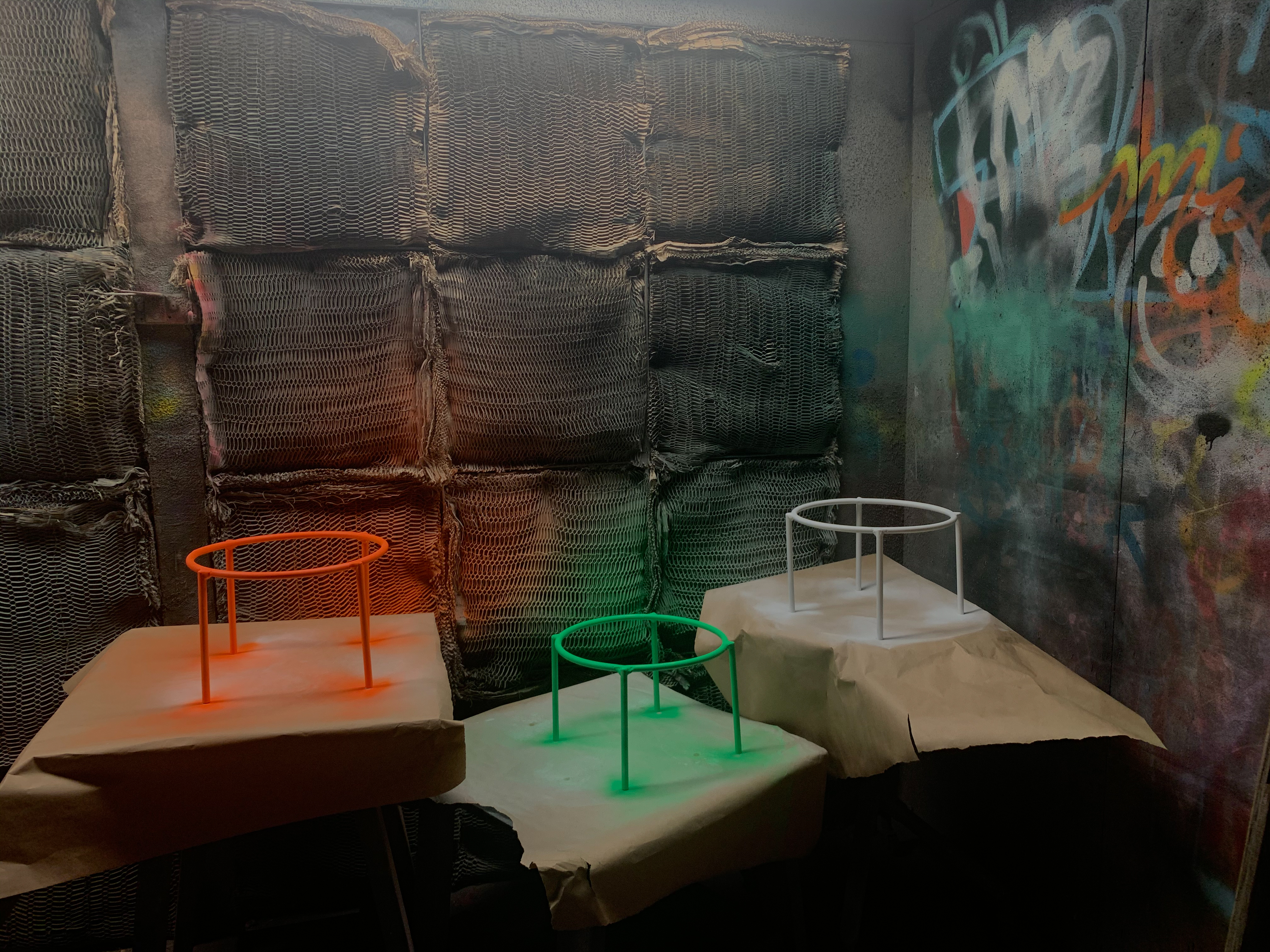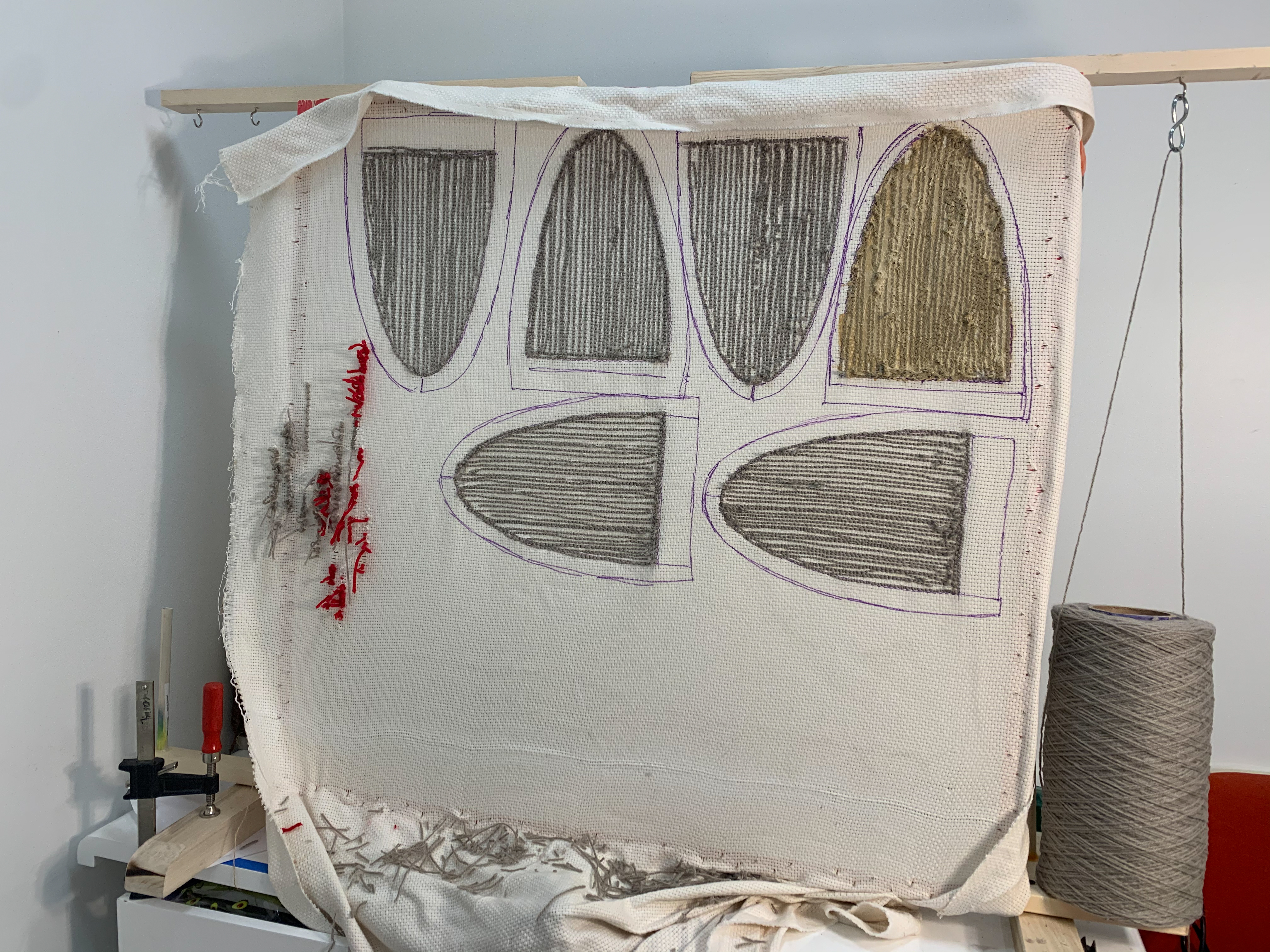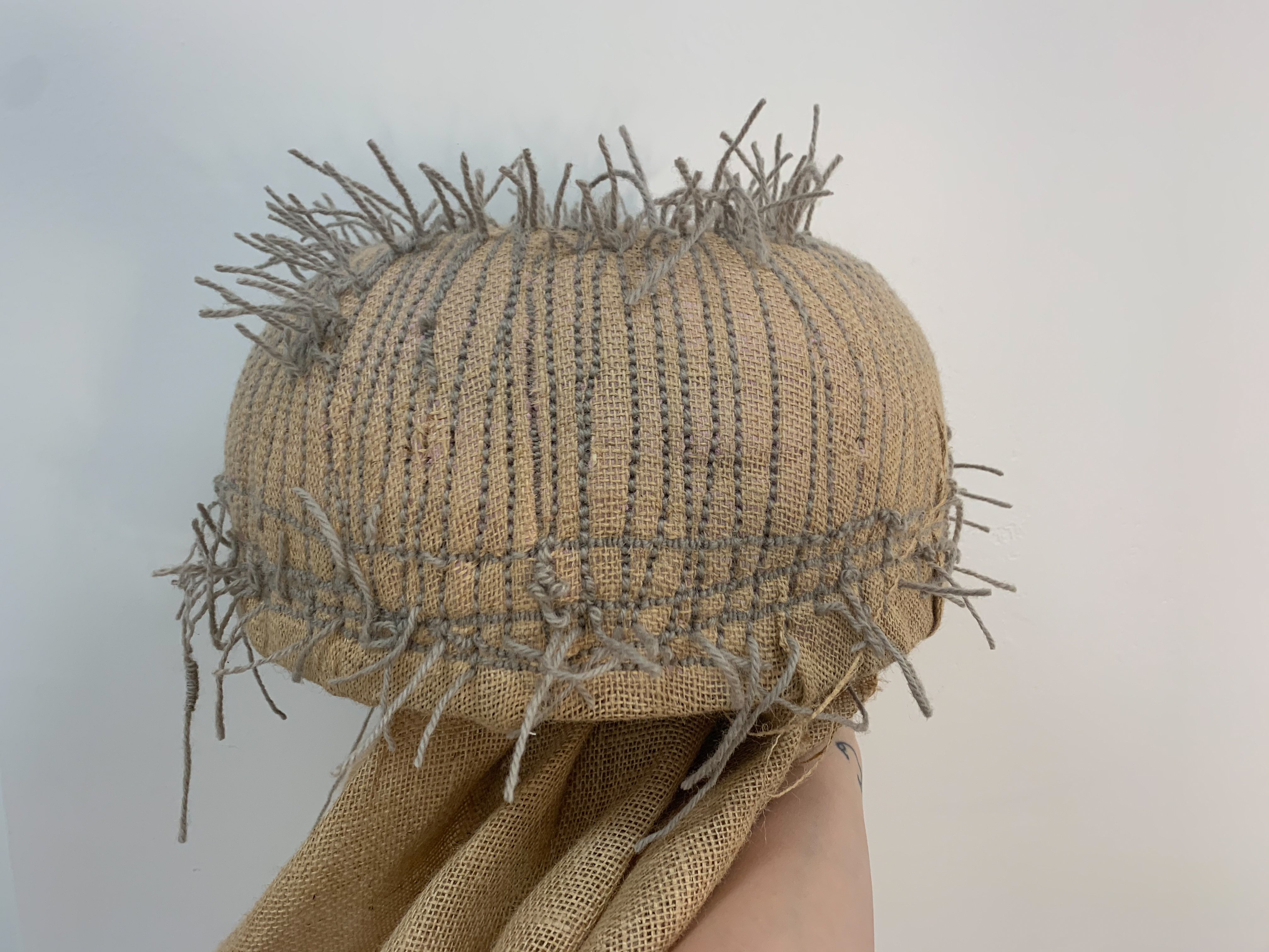 metal, yarn, monk cloth, muslin, upholstery foam, spray paint